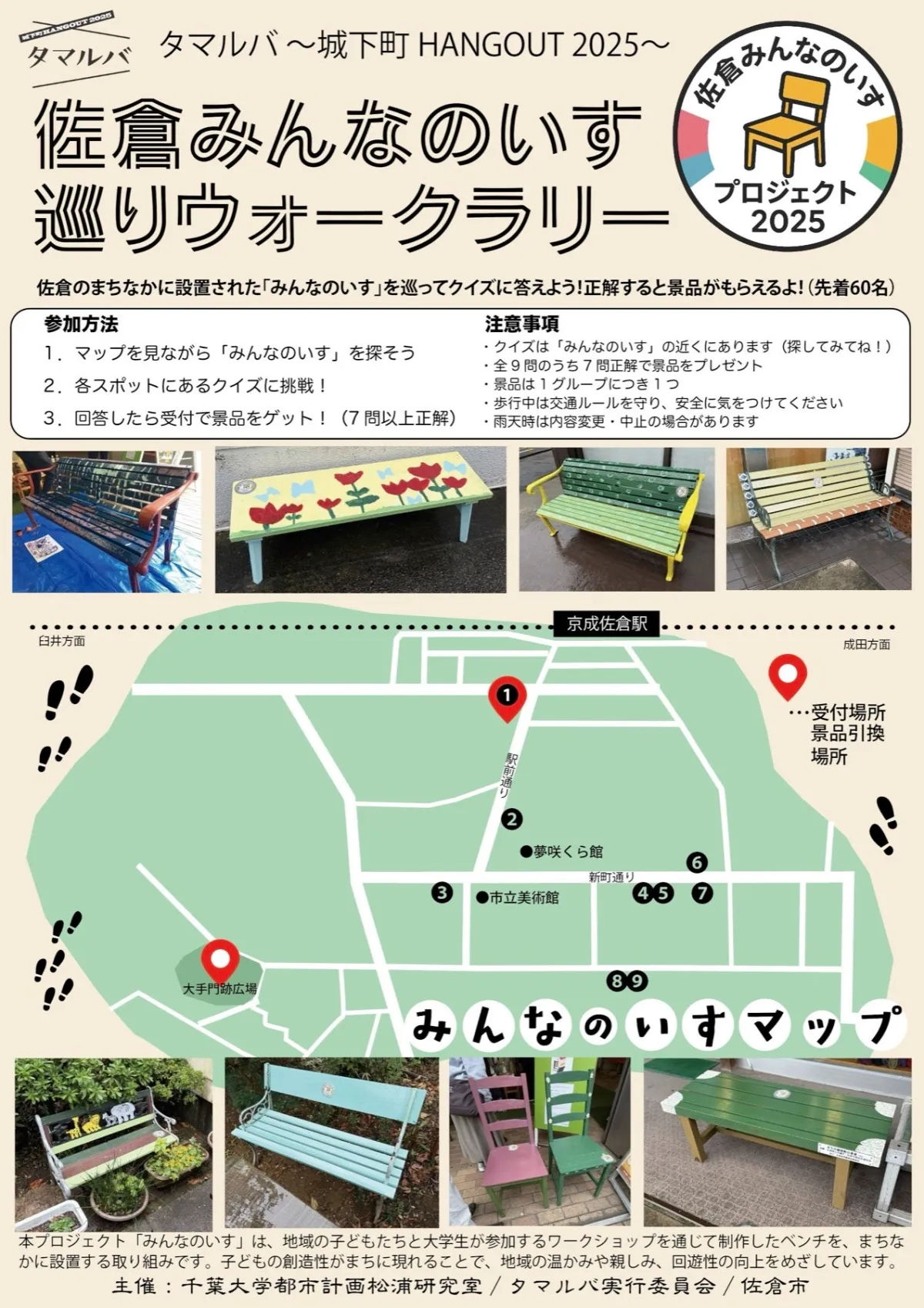 プロジェクトのイベントとして、2025年11月16日に「佐倉みんなのいすウォークラリー」が開催される予定です。このイベントでは、参加者はマップを手に持ち、設置された椅子を巡りながらクイズを解いていきます。正解者にはさまざまな景品が贈られるため、楽しみながら知識を深めることができます。このように、椅子は単なる座る場所ではなく、地域にちょっとした楽しみを提供する要素にもなっています。