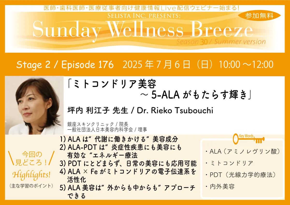 医療分野に携わる皆様に朗報です!2025年7月6日(日)午前10時より、無料のZoomオンラインセミナー『ミトコンドリア美容~5-ALAがもたらす輝き』が開催されます。本セミナーの講師は、銀座スキンクリニック院長であり、一般社団法人日本美容内科学会の理事でもある坪内利江子先生。新しいエネルギー療法として注目される5-ALA(アミノレブリン酸)について深く学べる貴重な機会です。