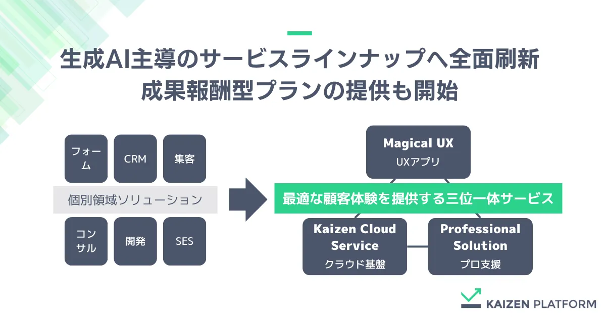 Kaizen Platformは、これまでに1,400社以上のUX改善を支援し、生成AI技術を活用した新しいサービスの開発に注力してきました。新たに提供されるサービスには、以下の3つがあります。