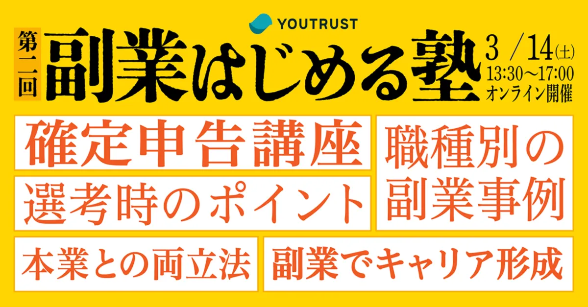 若い世代の需要に応えたオンラインイベント『副業はじめる塾』が、2026年3月14日(土)に開催されます。主催は株式会社YOUTRUSTで、このイベントは副業を始めたいと思っているビジネスパーソンを対象にしています。
