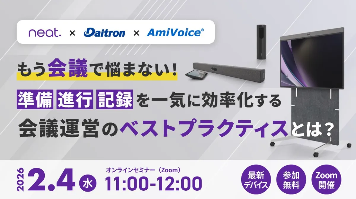 多くの企業や組織が抱える「会議の準備に手間と時間がかかる」「音声や映像のトラブルで会議が円滑に進まない」「議事録作成に時間がかかる」といった悩み。これらを解決するための新たな知識を提供するウェビナーが、2026年2月4日に開催されます。主催は株式会社アドバンスト・メディア、そしてNeatframe株式会社やダイトロン株式会社と共催で、参加者を対象にした内容となっています。