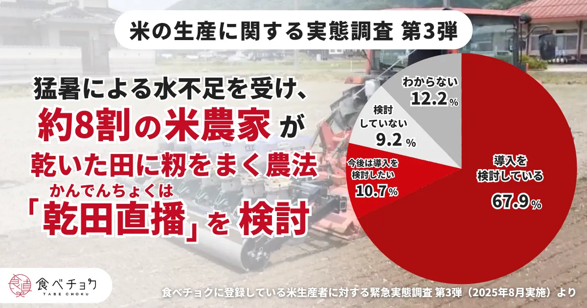 株式会社ビビッドガーデンが運営する産直通販サイト「食べチョク」は、今夏の水不足の影響を受けてお米の登録生産者への実態調査を行いました。その結果、93.9%の生産者が乾田直播を認知しているものの、実際に導入しているのはわずか5.3%にとどまることが明らかになりました。しかし、67.9%の生産者が導入を検討していると回答し、今後の導入意欲が78.6%に達することがわかりました。これは、気候変動が進む中で持続可能な米作りに対する期待感の表れと言えます。