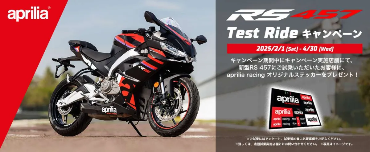 ピアッジオグループジャパン株式会社は、最新モデルのアプリリアRS 457の魅力を広く共有するために、2025年2月1日から4月30日まで「RS 457 TEST RIDEキャンペーン」を実施します。この機会に、洗練されたテクノロジーと純粋なレーシングスタイルを体験してみましょう。