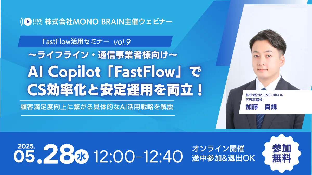 2025年5月28日、水曜日の12時より、株式会社MONO BRAINが主催する無料オンラインウェビナー「AI Copilot 'FastFlow'活用セミナー (vol.9)」が開催されます。このセミナーはライフライン・通信事業者を対象としており、カスタマーサポート(CS)の効率化を図るためのAI技術の活用方法について深く掘り下げます。