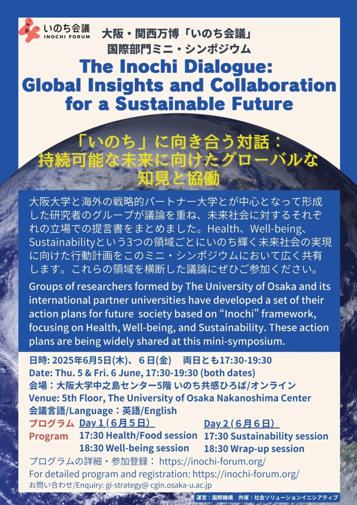 2025年6月5日(木)から6日(金)の2日間、大阪大学中之島センターで、持続可能な未来に向けて国際的な知見を共有するイベント「The Inochi Dialogue」が開催されます。このシンポジウムは、世界中の研究者が集まり、未来社会に関する議論を深めるための重要なプラットフォームとなることを目指しています。
