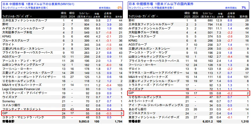 LSEGは、70カ国以上で金融市場のデータを提供する著名なデータプロバイダーです。M&Aリーグテーブルは、一定期間におけるM&Aアドバイザリーの実績をランキングとして公表するもので、金融機関にとって非常に重要な指標です。上位にランクインすることで、営業活動の促進や顧客への信頼感を与えるため、GIPにとっても今回の評価は大きな意味を持ちます。