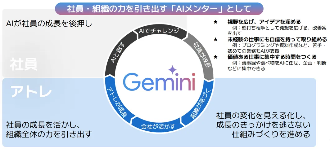 株式会社アトレは、首都圏の駅ビルを運営する企業であり、2025年4月からGoogleの生成AI「Gemini」を全社的に導入し、社員に寄り添うAI活用戦略「AIメンター」を開始しました。この選択は、企業の持続的な成長に向けた重要な一歩と位置づけられています。導入から約2ヶ月半が経過し、全社員の82%がGeminiを利用しており、その中で約25%の社員がエキスパート認定を受けるなど、AIが業務に密接に関わる存在として定着しています。