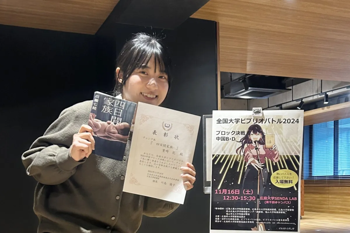 広島市に位置する叡啓大学の4年生、豊﨑花さんが「全国大学ビブリオバトル2024」に出場することが決まりました。彼女は、広島大学東千田キャンパスで開催された中国B・Dブロック決戦で見事優勝を果たし、全国大会に進出する栄光を手にしました。