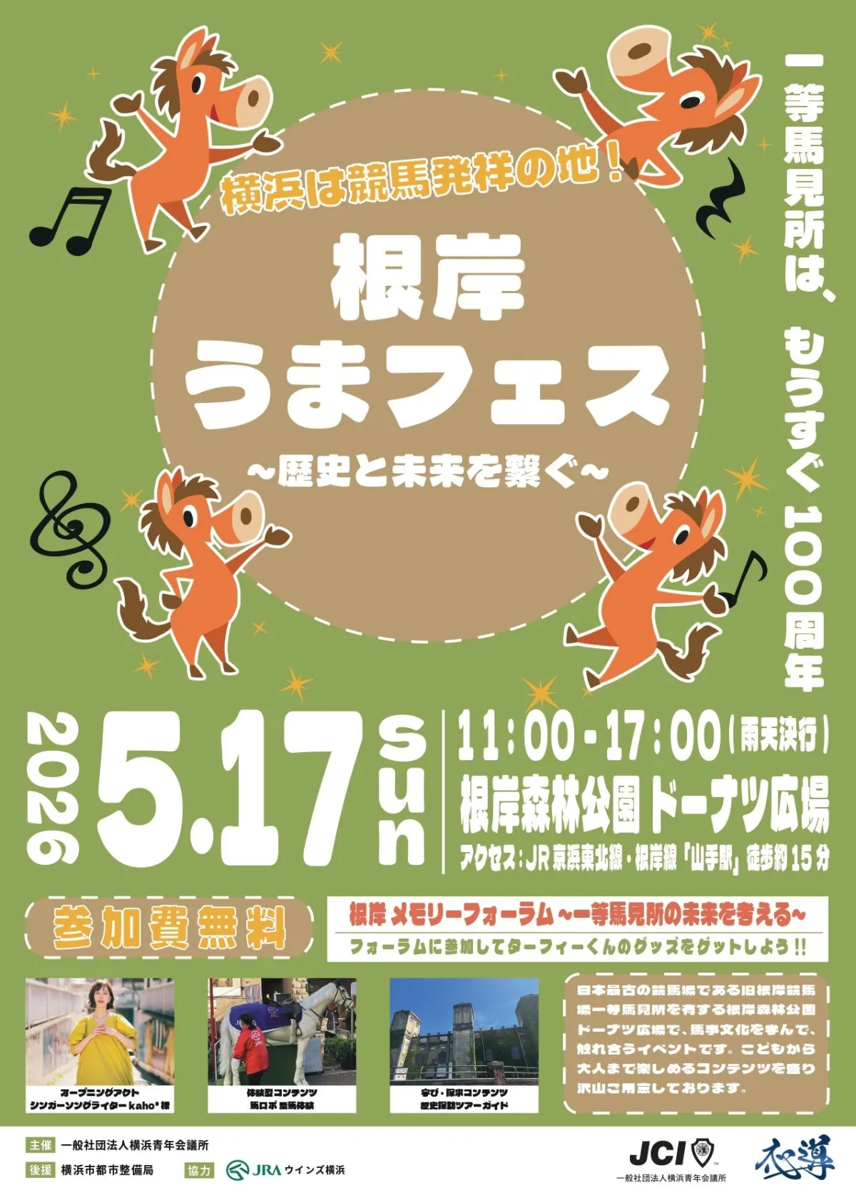 イベントは午前11時から午後5時まで行われ、さまざまなプログラムが予定されています。オープニングアクトはシンガーソングライターkaho*が務め、多彩なパフォーマンスが披露されます。また、根岸メモリーフォーラムや馬ロボ乗馬体験など、参加者が楽しめる体験型アクティビティが充実しています。