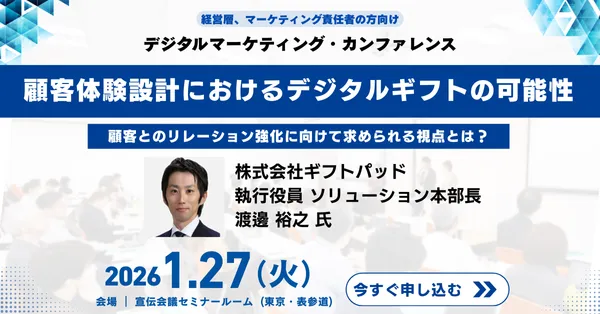 2026年1月27日、株式会社ギフトパッドが主催する「デジタルマーケティング・カンファレンス2026」に登壇します。このカンファレンスは、デジタル施策や成功事例に焦点を当て、実務者向けに役立つ知識を提供します。場所は東京都港区南青山にある宣伝会議セミナールームで、参加は無料ですが事前登録が必要です。