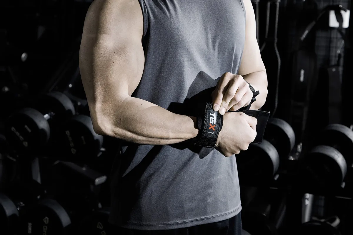「TGX パワーグリップ」は主に背中のトレーニングで使用されるアイテムです。手首に着用し、ゴム製の部分をバーベルなどに巻き付けることで、高重量でも握力を気にせずトレーニングが行えます。この設計により、動作中のずれや滑りが軽減され、力をスムーズに伝達できるため、効率的なパフォーマンスが可能になります。