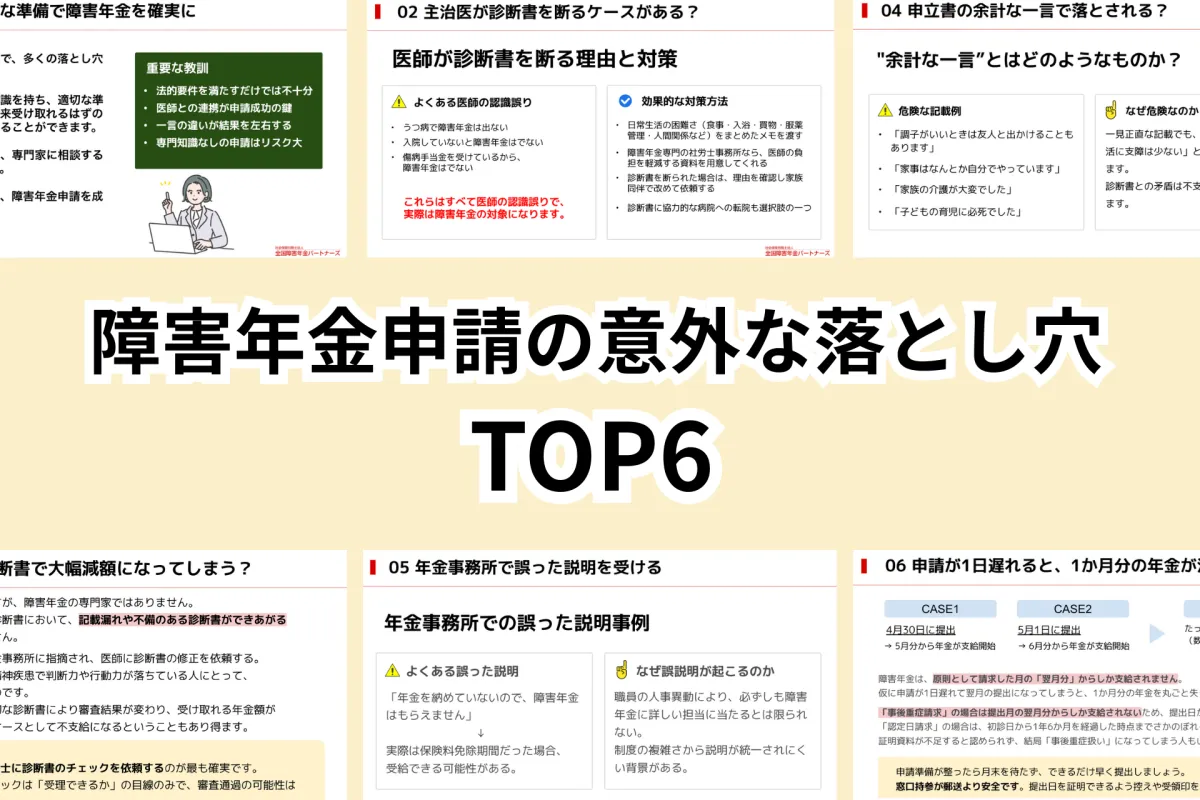 このような背景を受け、社会保険労務士法人 全国障害年金パートナーズは、「障害年金申請の意外な落とし穴 TOP6」と題した資料を公開し、申請を成功に導くための具体的な注意点を詳しく解説することになりました。