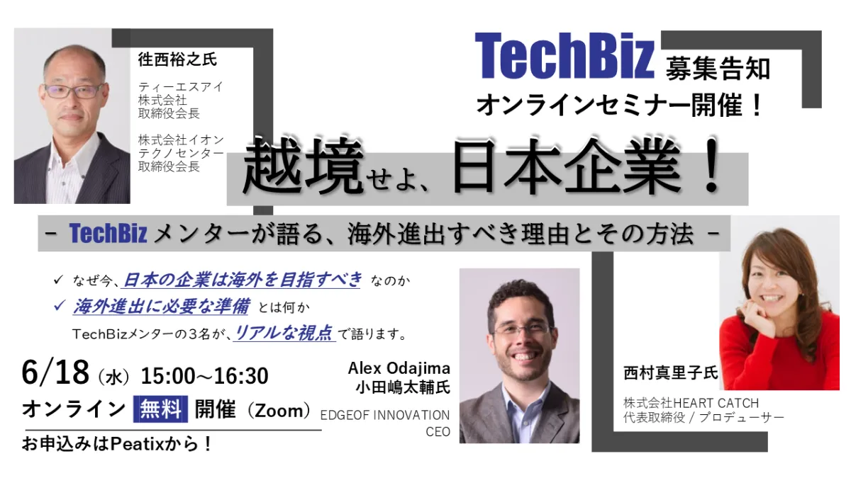 このプログラムに関連する特別ウェビナー、「越境せよ、日本企業!-TechBizメンターが語る、海外進出すべき理由とその方法-」は、2025年6月18日(水)に開催されます。このウェビナーでは、海外展開のプロフェッショナルたちが登壇し、日本企業がなぜ今、海外進出を進めるべきなのか、必要な視点や準備について具体的に語ります。