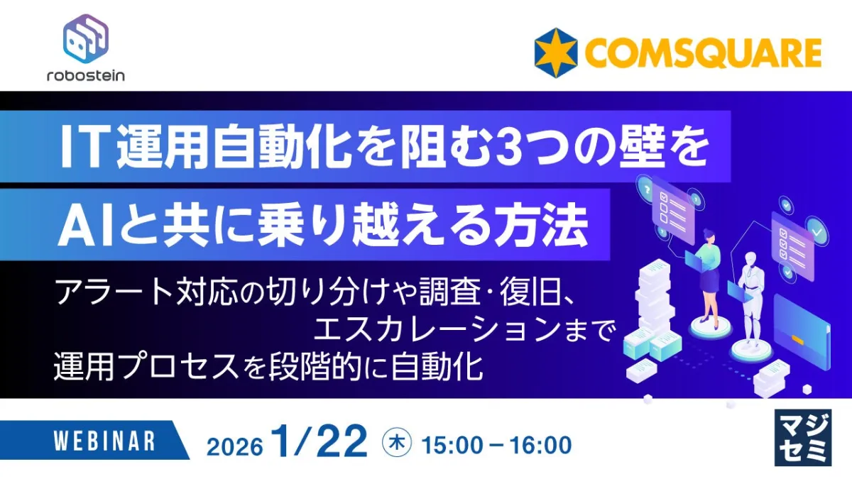 このウェビナーでは、運用自動化の第一歩を軽減する手法を紹介します。純国産のローコード自動化基盤『ロボシュタイン』を使用し、アラート対応や障害調査、復旧プロセスを段階的に自動化するアプローチを紹介します。さらに、AIを活用した自動化フローの生成機能を加えることで、前述の3つの壁をどのように克服し、持続可能な自動化推進が可能かを解説します。