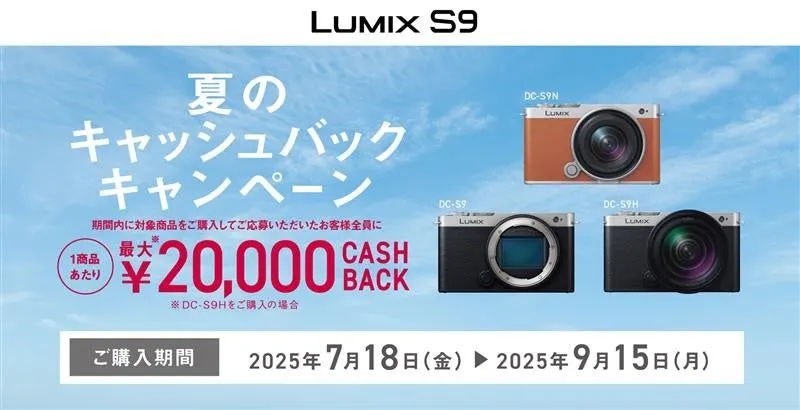 パナソニック株式会社は、2025年7月18日から9月15日までの期間に購入したフルサイズミラーレス一眼カメラ「LUMIX S9」に対して、最大20,000円のキャッシュバックを受けられる「LUMIX S9 夏のキャッシュバックキャンペーン」を実施します。このキャンペーンは、地元のパナソニック家電製品正規取扱店から対象商品を購入した顧客を対象としています。