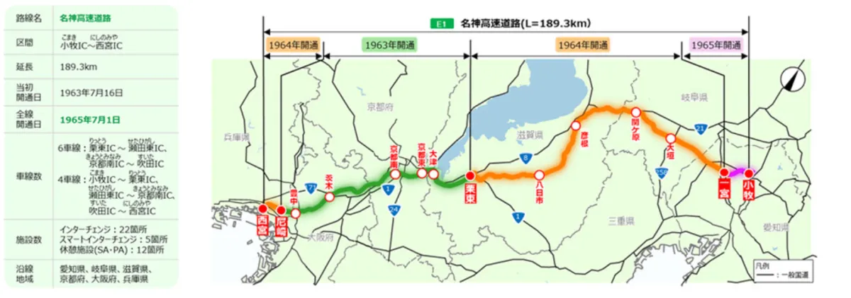 E1名神高速道路が、令和7年の7月1日に全線開通60周年を迎えることになりました。これを祝うため、NEXCO西日本関西支社(本社:大阪府茨木市)は、開通からこれまでの整備効果を取りまとめて発表しました。