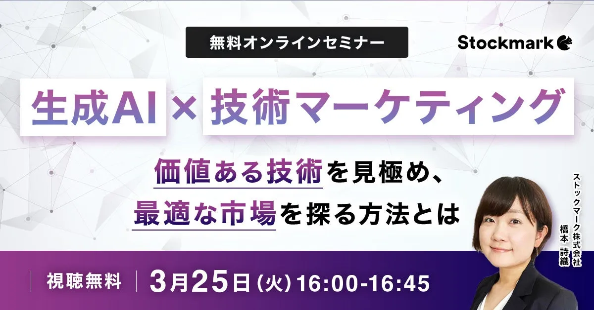 ストックマーク株式会社が主催するオンラインセミナー『生成AI × 技術マーケティング ─ 価値ある技術を見極め、最適な市場を探る方法とは』が、2025年3月25日(火)に開催されます。このセミナーでは、生成AIを活用して技術マーケティングを進める新たな方法論について探求します。