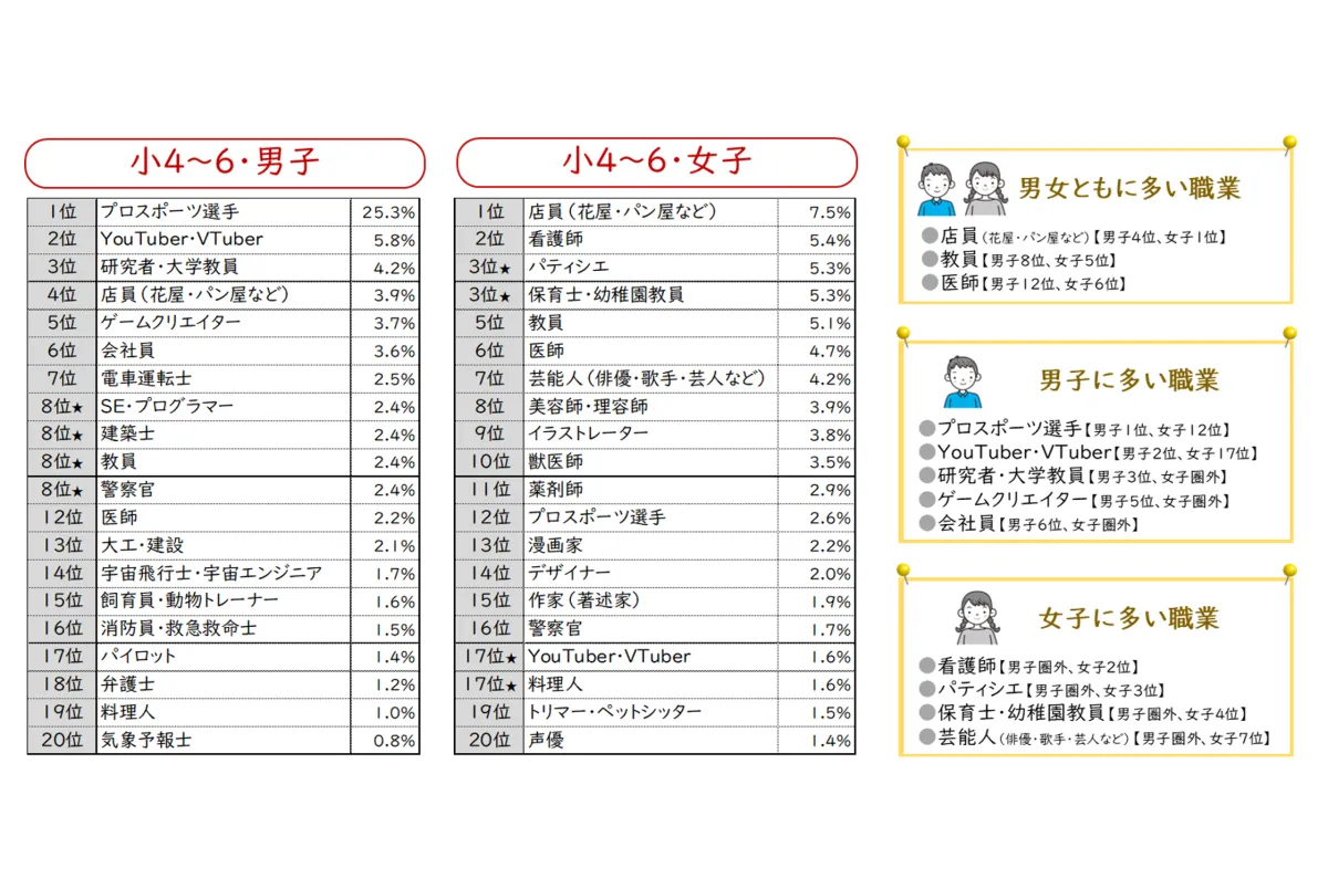 特に注目すべきは、小学生では「プロスポーツ選手」が圧倒的な人気を誇っています。この傾向は、特に男子において顕著で、次いで「YouTuber・VTuber」が人気を集めていることも新しい特徴です。
