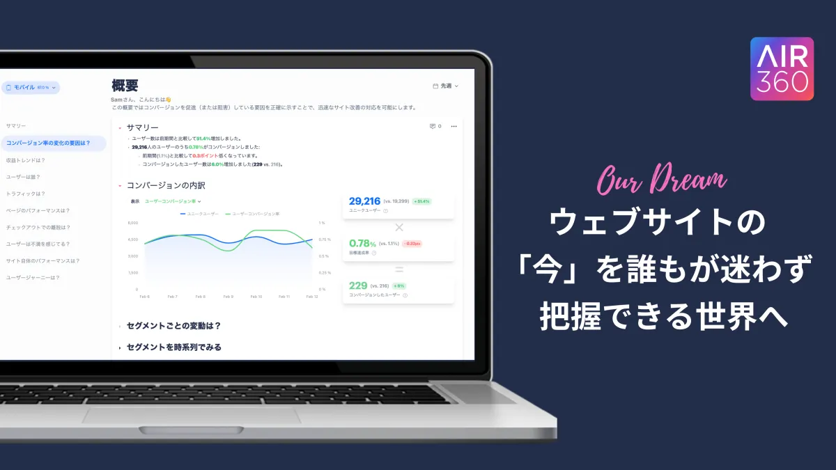 AIR360のビジョンはシンプルです。「誰もがウェブサイトのモニタリングやインサイトの取得を当たり前のように行える世界」を目指しています。マーケティング担当者、ECチーム、デジタル部門にかかわらず、エンジニアやデータサイエンティストの手を借りることなく、自らユーザーの動きを理解し、改善策を打てる環境を提供します。