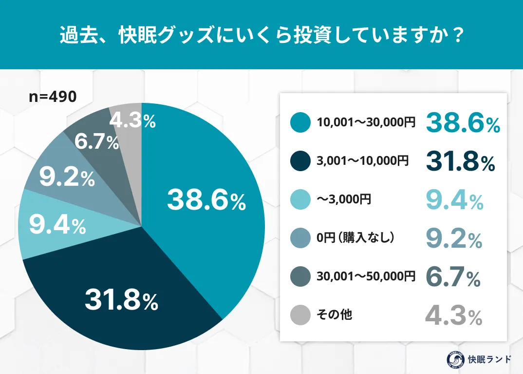 「快眠グッズ」に対する投資意識の高さが顕著で、回答者の約7割が1万円以上を快眠アイテムに投資していることがわかりました。特に「10,001〜30,000円」と回答した人が38.6%と最も多く、これは明らかに睡眠改善への意識の強さを示しています。