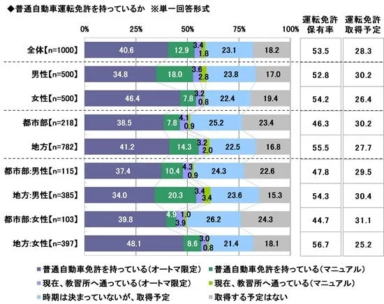 調査結果によると、2025年の運転免許保有率は53.5%で、これは前年比での下降を示しています。2024年には56.2%、2023年には61.2%と、徐々に減少傾向が続いています。このデータからは、運転免許を持つ若者が減少していることが伺えます。特に、都市部では46.3%と、地方の55.5%に比べて低い数値が見られました。女性ではオートマ限定の免許保有率が46.4%と高い一方で、男性ではマニュアル免許の保有率が18.0%という数字が示されています。