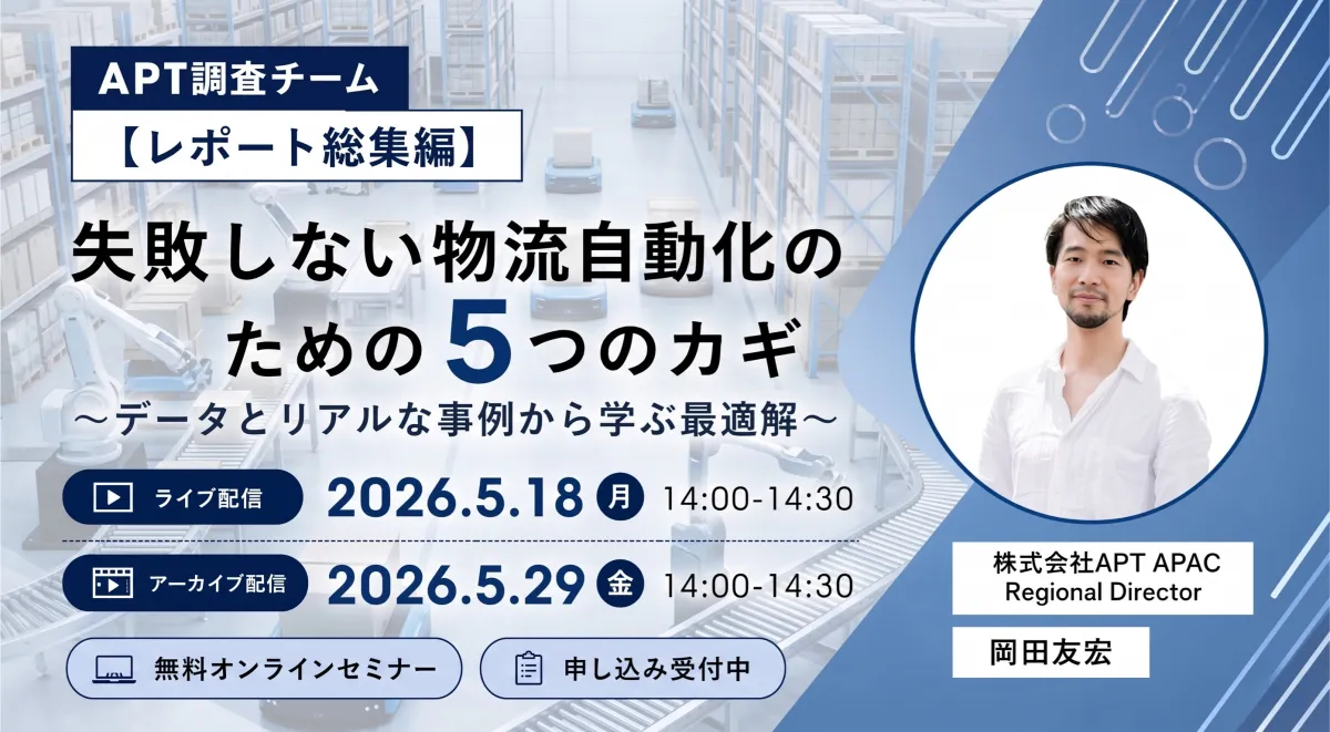 物流システムエンジニアリングを異業種から支援し続けている株式会社APTが、2026年5月18日(月)に特別なオンラインセミナーを開催します。このセミナーのテーマは、「失敗しない物流自動化のための5つのカギ ~データとリアルな事例から学ぶ最適解~」。