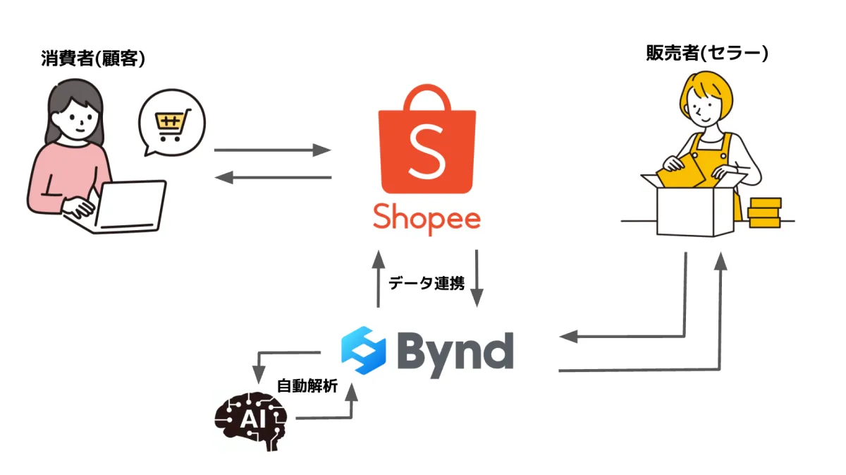 「Bynd」は、日本語で運営されているECサイトの商品データをShopeeなどの海外モールに自動で連携し、一つの画面で管理できるシステムです。生成AIを活用し、翻訳作業や顧客対応まで代行してくれるため、語学力や専門知識がなくても、簡単に越境ECを展開できます。