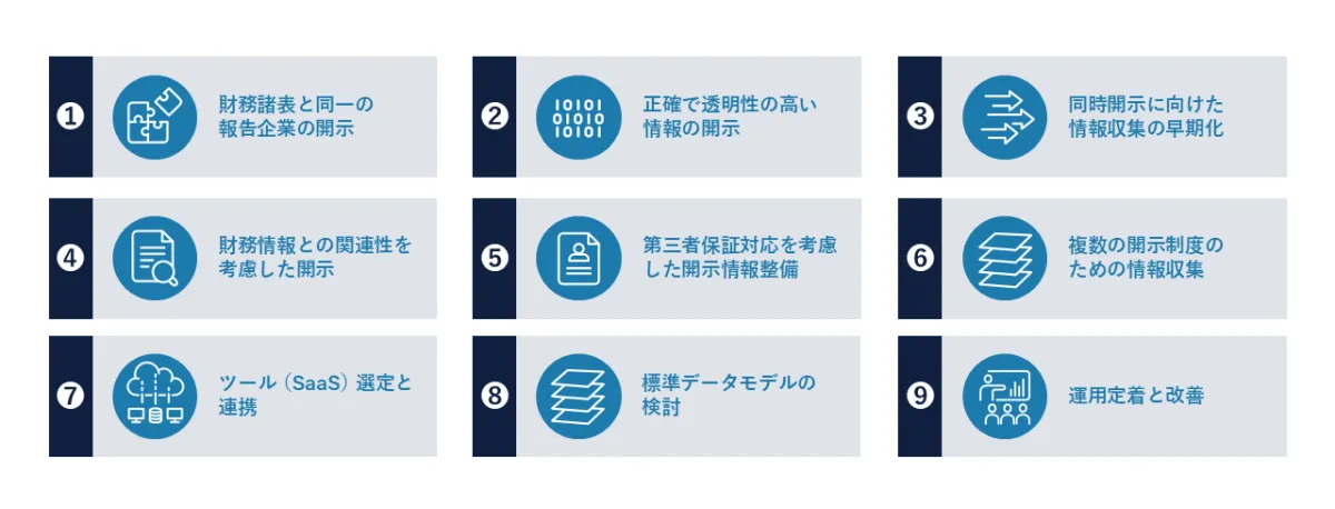 収集・検証・報告プロセスの最適化を行います。運用テンプレートの整備や標準作業手順書(SOP)の作成、外部監査人との連携を含むパッケージの提供を行い、実務的に機能する開示運用を支援します。