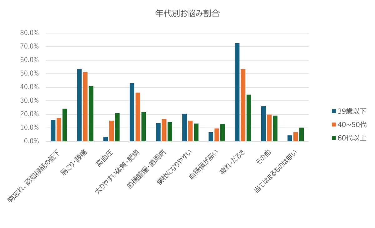 調査では、認知機能の低下についての不安が60歳以上では23.8%と減少しているものの、40歳から50歳の世代では逆に心配を感じる人が増えていることが明らかとなりました。特に、40代から50代の約60.6%が「物忘れ・認知機能の低下」を将来の健康不安として挙げています。このことは、認知症患者の増加傾向を背景に、より早期に自分ごとの課題として捉えられるようになってきたことを示唆しています。
