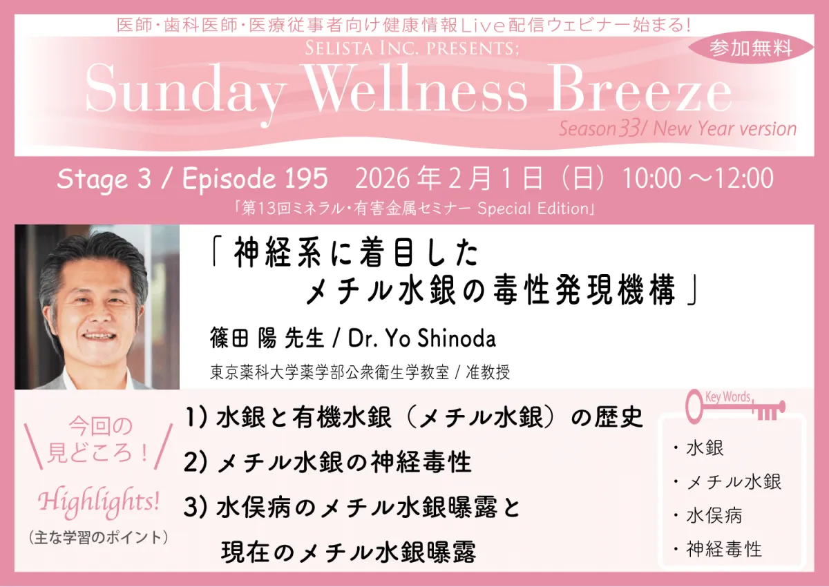 2026年2月1日、医師や歯科医師などの医療従事者を対象とした無料のオンラインセミナーが開催されます。このセミナーでは、東京薬科大学の篠田 陽准教授が、神経系にフォーカスをあてたメチル水銀の毒性発現メカニズムについて解説します。