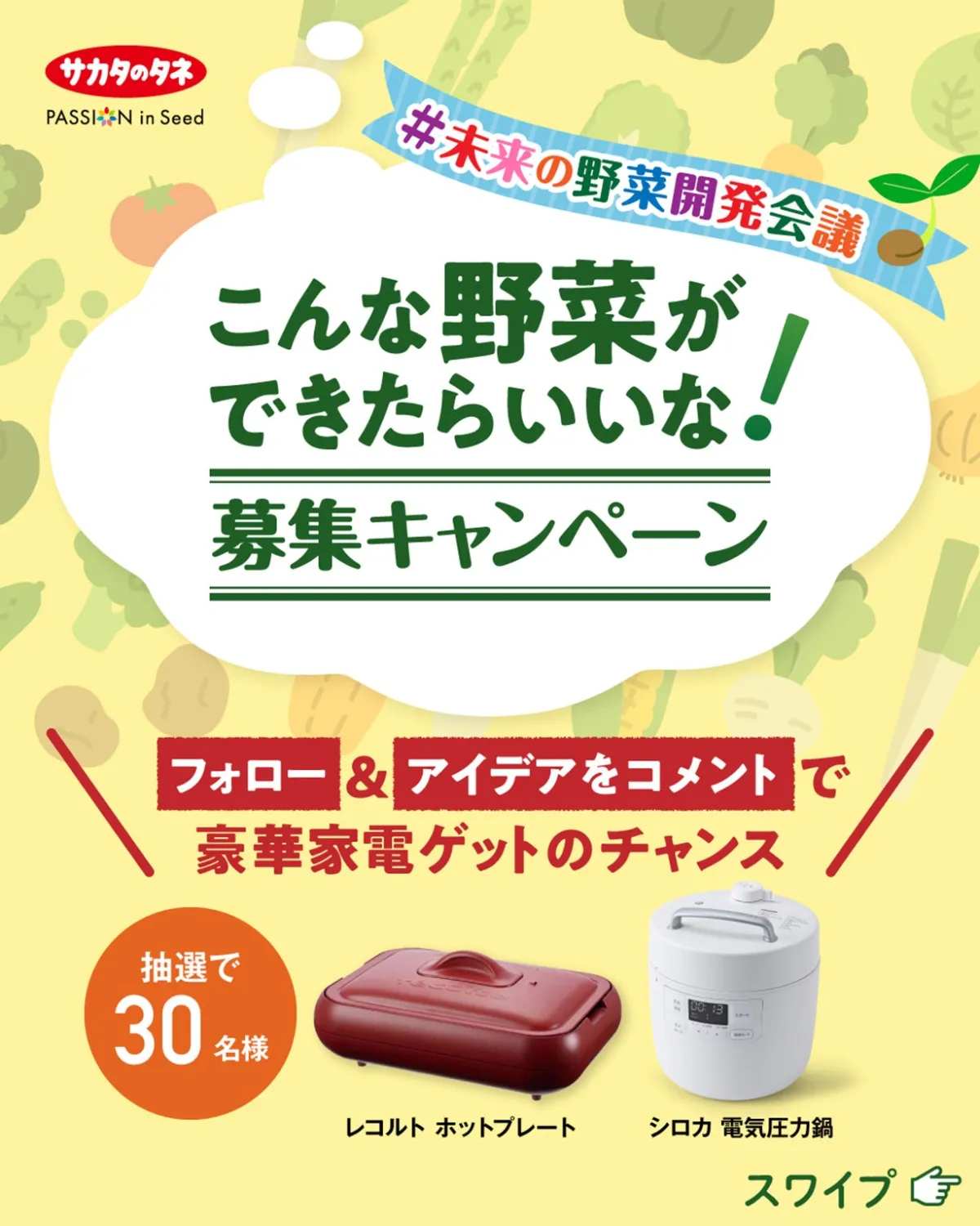 2025年の4月10日から5月5日まで開催されるこのキャンペーンは、サカタのタネのInstagram公式アカウントを通じて参加できます。Instagramを利用してアイデアを送信することで、抽選で「レコルト ホットプレート」や「シロカ 電気圧力鍋」などの豪華賞品が当たります。