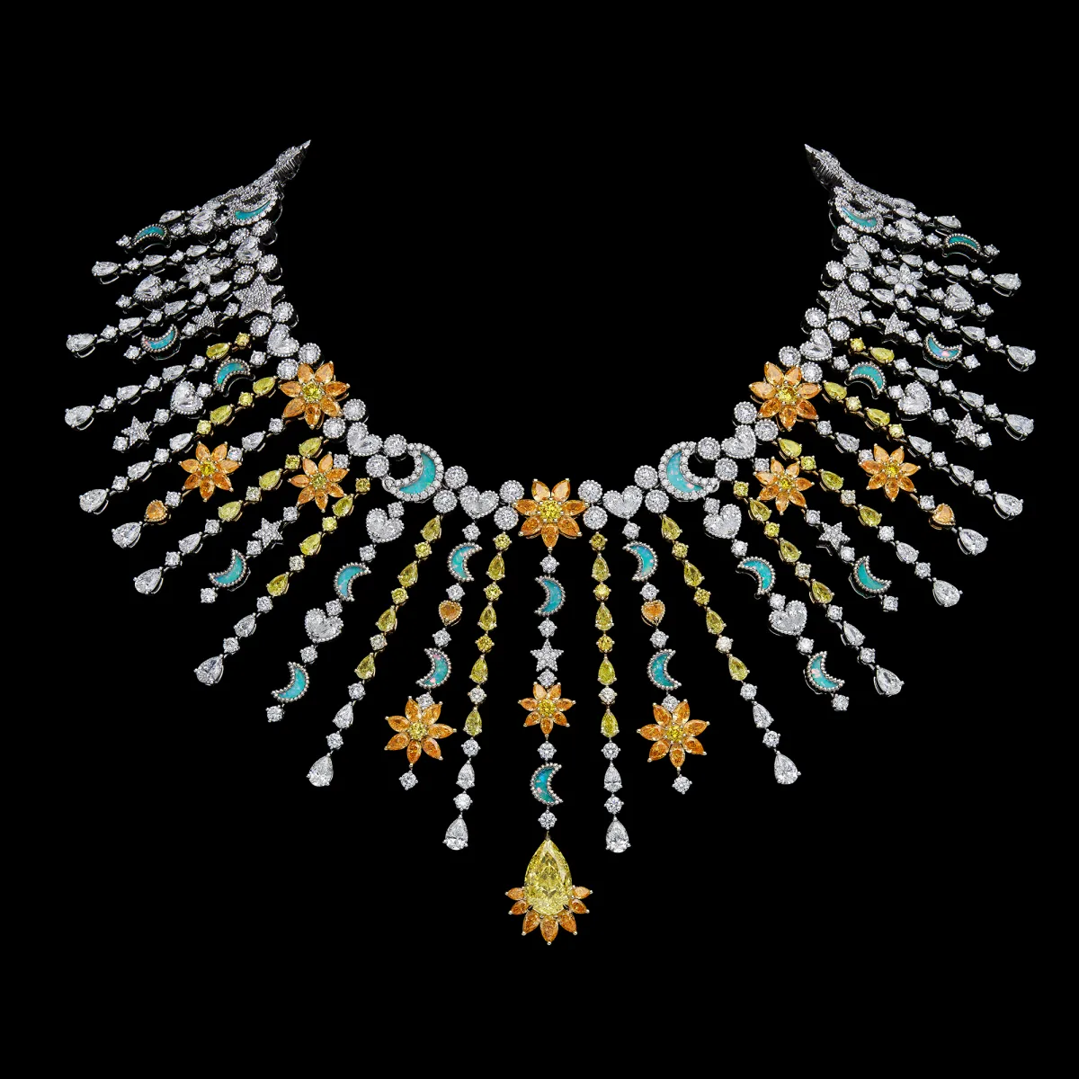 特に「Soleil Céleste」と名付けられた一連の作品は、占星術に対するディオールの情熱をたたえ、ミステリアスな世界観を表現しています。ビブネックレス、リング、イヤリングのほか、チョーカーとしても活用できるブレスレットには、イエローダイヤモンドやターコイズなど、眩い光を放つ宝石があしらわれています。これに加え、ブラックオパールの月にはダブレット技法が施され、華やかさが際立っています。