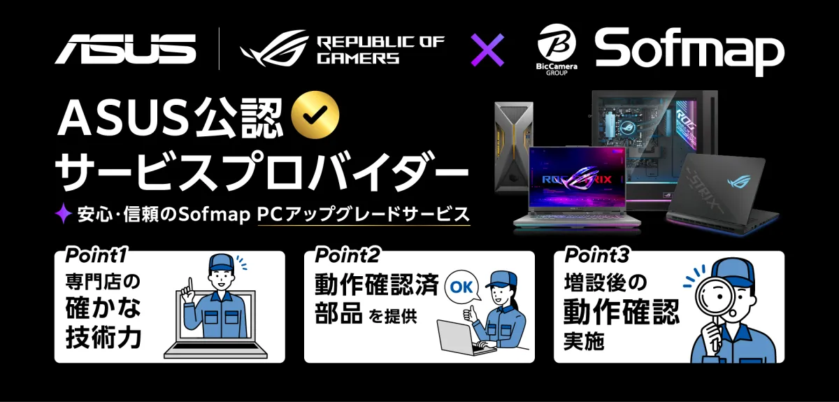 ASUS JAPAN株式会社と株式会社ソフマップは、2025年11月1日から「ASUS公認サービスプロバイダー」として新たなメモリとSSDの増設サービスを提供することを発表しました。このサービスは、ASUSおよびROGのノートPCやデスクトップPCの性能向上を目的としたもので、メーカー公認の技術を用いています。