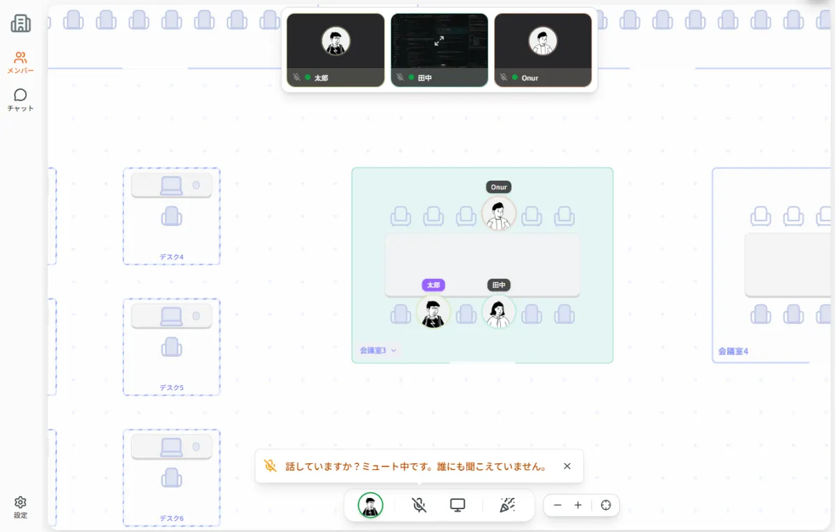 『Zaseki』は、フラットなフロアマップ上に、デスクや会議室を配置し、そこにメンバーの顔写真やステータスを表示します。アバターが歩き回る演出はなく、非常にシンプルです。音声は、会議室に入った時や接続した際にのみ有効になるため、常にマイクが開いているわけではありません。この設計により、プライバシーが保たれ、無駄なコミュニケーションを避けることができます。