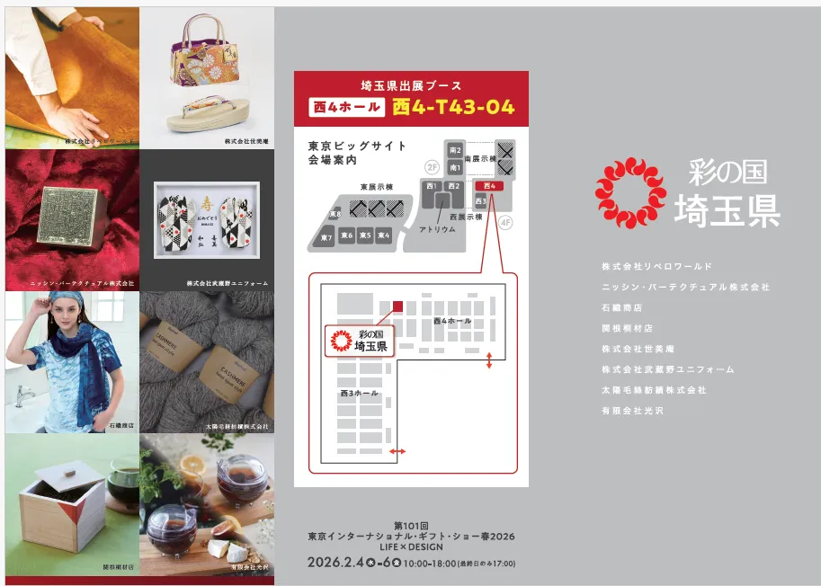 開催日時は、令和8年2月4日(水)から6日(金)までの3日間で、毎日午前10時から午後6時まで行われます。最終日の6日は午後5時までとなっています。場所は東京ビッグサイトの西展示棟、西1・3・4ホール及びアトリウムとなっており、埼玉県ブースは西4ホールに位置します。ブース番号は「西4-T43-04」で、特に「伝統とModernの日本ブランドフェア」というエリアに配置され、地元の職人たちによる技術や製品が並びます。