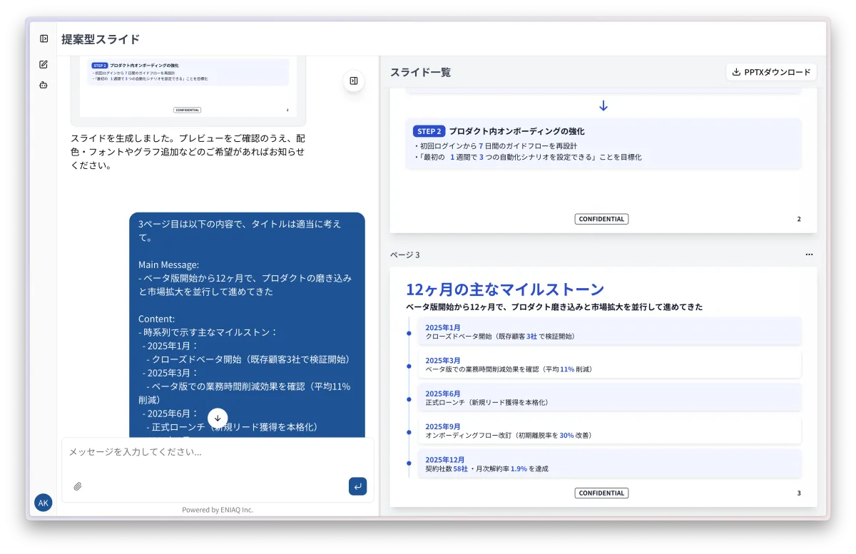 ENIAQの開発した対話型スライド生成AIは、独自の生成方式により、生成AI特有の文字の重なりやレイアウト崩れを抑制します。ユーザーは自分の言葉で指示を出すことで、スライドの内容を自然に修正や調整が可能です。例えば、「4枚目のスライドのKPIをもっと目立たせてほしい」といった具体的なリクエストができます。これにより、ユーザーはスライドの初期段階から修正までの一貫したプロセスを効率的に管理できます。