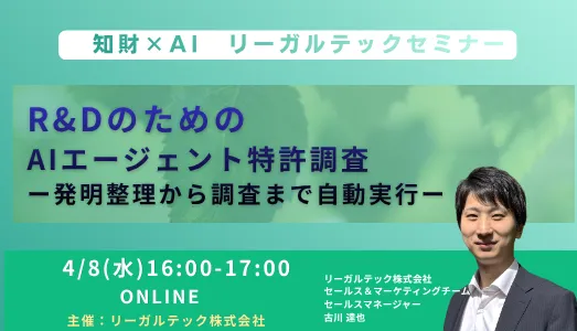 2026年4月8日(水)16時から、オンラインで第29回知財×AIリーガルテックセミナーが開催されます。テーマは「R&DのためのAIエージェント特許調査ー発明整理から調査まで自動実行ー」です。