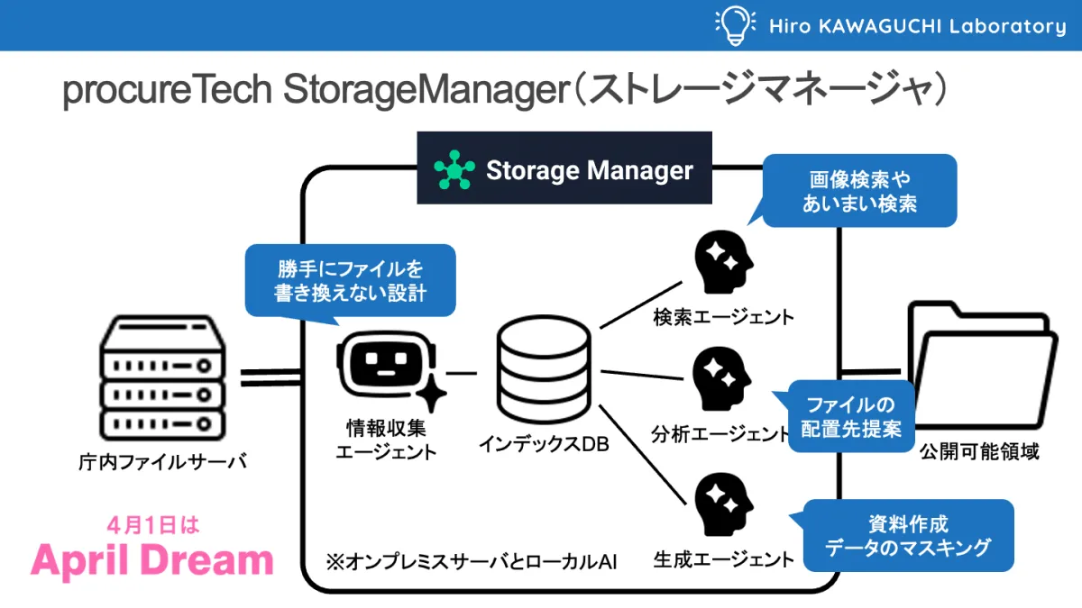川口弘行合同会社の提供する「procureTech StorageManager」は、AIエージェントを用いたファイル管理支援システムです。このシステムは、散在するファイルを自動で分析・整理し、業務の改善に役立てることができます。さらには、情報の機密性に応じてローカルAIとクラウドAIを使い分ける設計も施されておりセキュリティ面でも配慮されています。