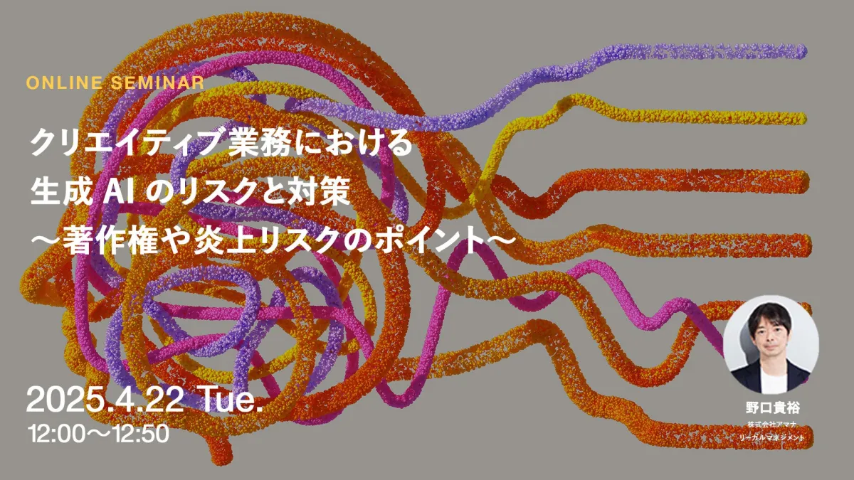 2025年4月22日(火)、株式会社アマナがオンラインセミナーを開催します。テーマは「クリエイティブ業務における生成AIのリスクと対策〜著作権や炎上リスクのポイント〜」。このセミナーでは、生成AIがクリエイティブ業務にもたらす利点とともに、その利用に伴うリスクについて詳しくお話します。