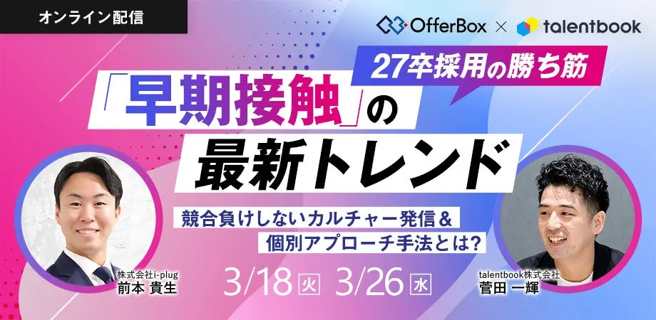 2025年3月18日、株式会社i-plugの前本貴生氏をゲストに迎えた「27卒採用」に関するオンラインイベントが開催されます。このイベントは、新卒採用市場が早期化している背景を理解し、企業がどのように戦略を立てるべきかを探る貴重な機会です。