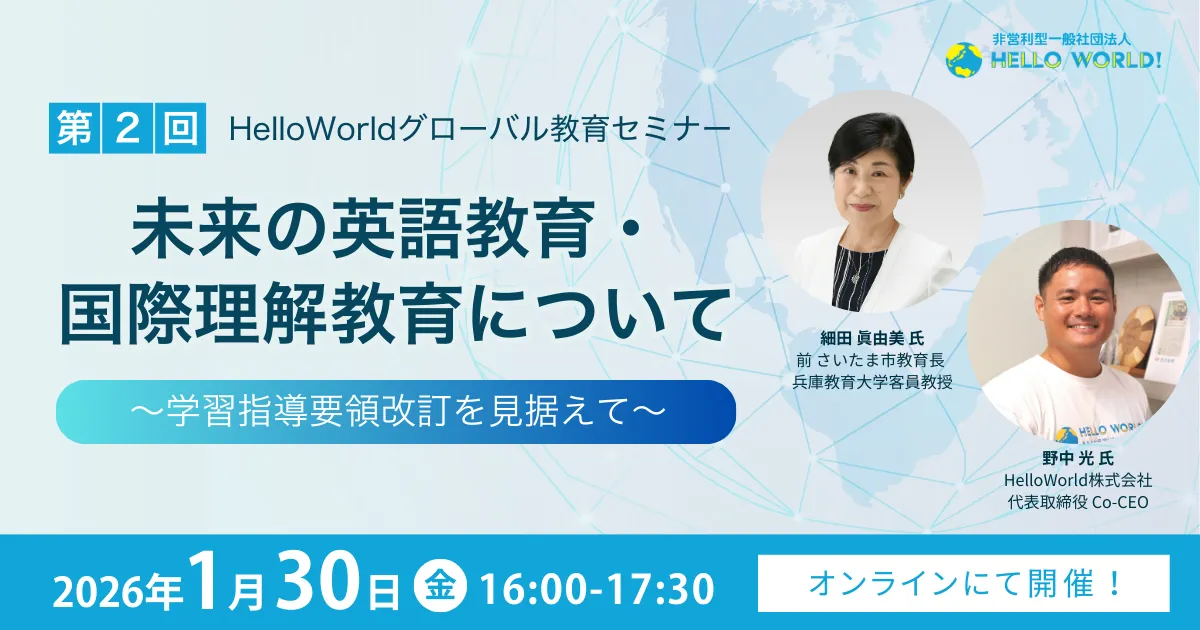 2026年1月30日、沖縄市に本拠を置く非営利型一般社団法人HelloWorldが、「未来の英語教育・国際理解教育」をテーマにしたオンラインセミナーを実施します。このイベントは、全国の教育関係者を対象としており、特に教育委員会、英語科の教師、国際教育に携わる方々に向けての貴重な機会です。