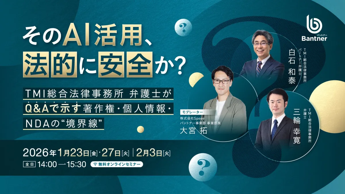 1月23日、27日、2月3日の3日間にわたり開催される本ウェビナーでは、法的にAIを安全に活用するための「正しい恐れ方」を参加者に提供します。具体的な内容として、「NDA情報をAIに入力することは許可されるのか?」や「AI生成物の著作権は誰に属するのか?」など、実務からのリアルな疑問への回答が用意されています。