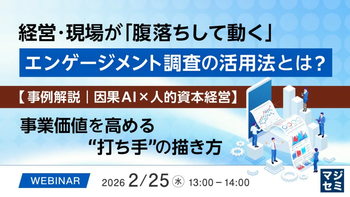「経営・現場が『腹落ちして動く』エンゲージメント調査の活用法とは?」というテーマのウェビナーでは、以上の内容に加え、具体的なデータ分析手法や施策に直結するヒントを得られる貴重な機会です。現場での課題解決やエンゲージメントの向上に興味がある方は、ぜひご参加ください。