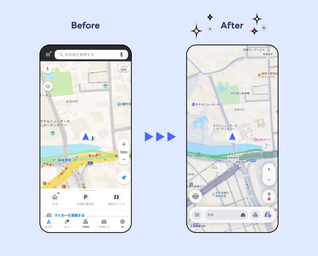 地図上の色合いが調整され、道路はこれまで以上に見やすくなりました。また、マップボックス社の先進技術を利用した柔軟なカラーリングやフォント変更により、ブランドのアイデンティティを保ちながらも、視認性が向上しています。このような細かな配慮が、運転中のストレスを軽減します。