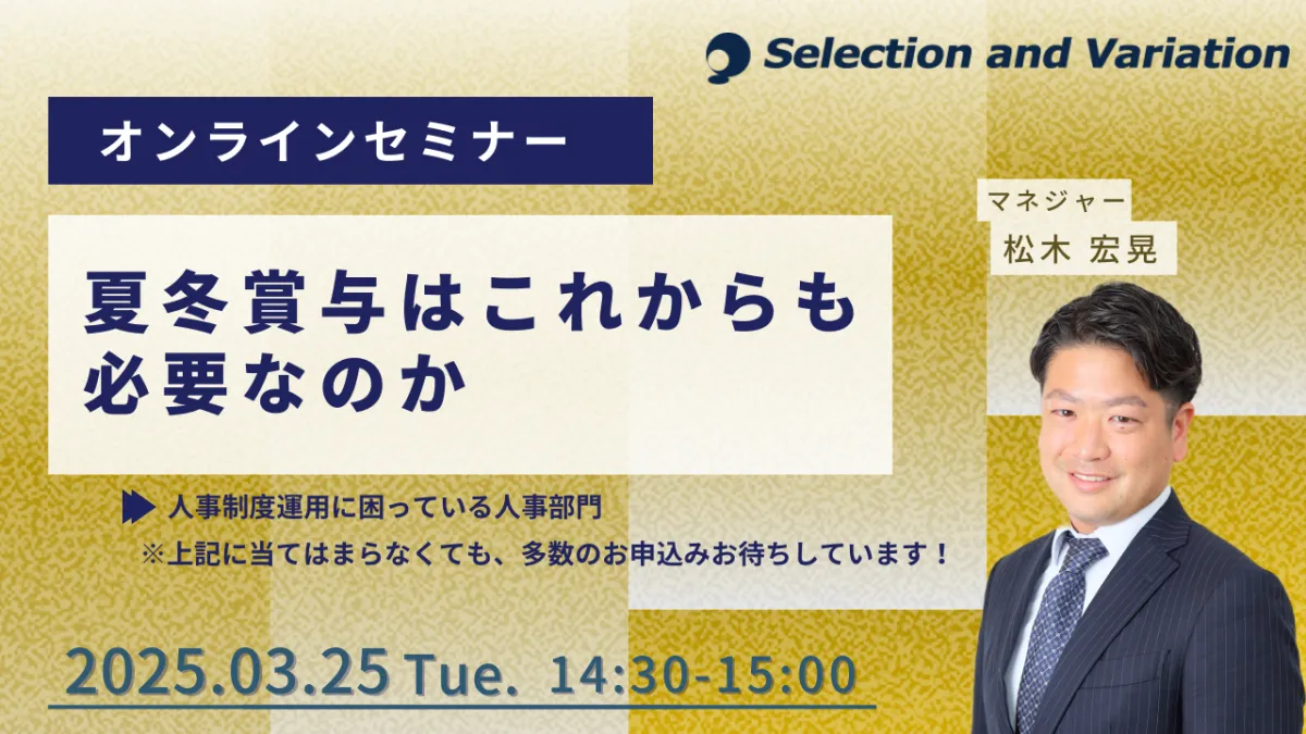セレクションアンドバリエーション株式会社が主催する「夏冬賞与はこれからも必要なのか」というテーマのセミナーが、2025年3月25日(火)にオンラインで開催されることが決定しました。本セミナーでは、長らく日本企業に根付いている夏冬賞与のあり方を見直し、今後の労働環境における人件費の調整メソッドとしての役割について考察します。