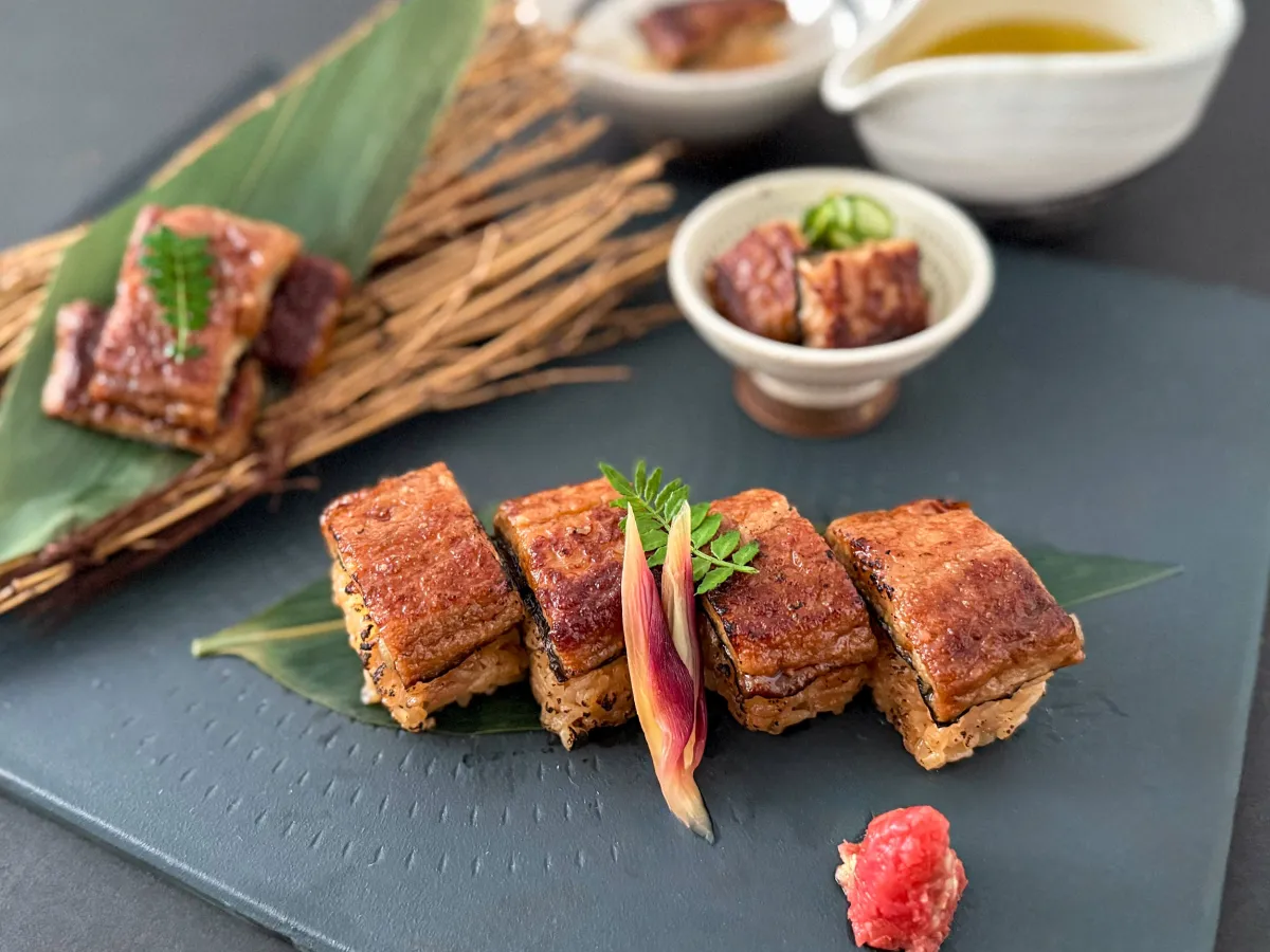 藤田シェフは、九州の食材をふんだんに活用し、精進料理から着想を得た「精進鰻づくし」を創作しました。もめん豆腐や山芋、牛蒡、海苔を使い、味わいや食感を濃厚に再現したこの料理は、蒲焼、寿司、酢の物、お茶漬けといった多彩なスタイルで提供されます。提供期間は2026年2月15日から3月14日です。