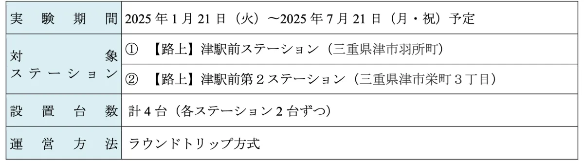 本実験において、カーシェアリングステーションは津駅東口の駅前ロータリーと県道津停車場線に設置されます。このような形態のカーシェアリングステーションの開設は日本では初めての試みです。これにより、地域住民や観光客が手軽に利用できる環境が提供され、路上でのカーシェアリングの導入が実際にどう機能するのかを見極めることが期待されます。