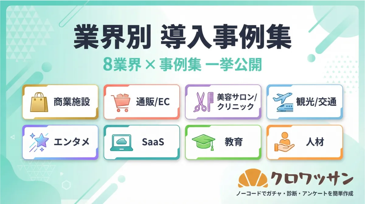 株式会社on the bakery(神奈川県横浜市)は、ノーコードでオンラインガチャ、診断、アンケートを簡単に作成できるマーケティングツール「クロワッサン」の活用事例集を発表しました。この事例集は、商業施設や百貨店から通販、教育業界までの8つのカテゴリに分かれています。それぞれの業界に特化した活用方法を具体的に示しており、業種に応じたマーケティング施策のヒントを提供しています。