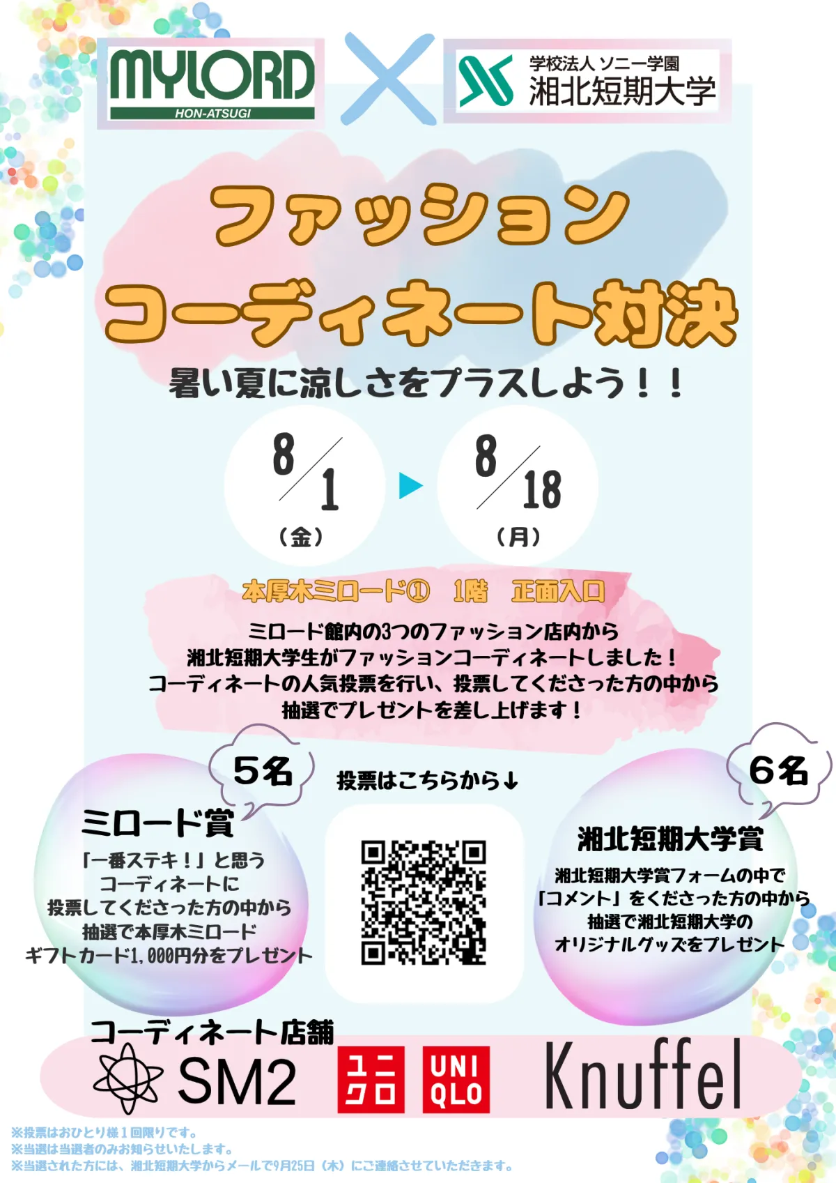 来場者による人気投票の結果、一番素敵だと思われたコーディネートには「ミロード賞」が贈られます。投票に参加した方の中から抽選で、各5名に本厚木ミロードの1,000円分ギフトカードが当たります。また、投票フォームにコメントを提供した方の中からも湘北短期大学のオリジナルグッズが当たるチャンスがあります。