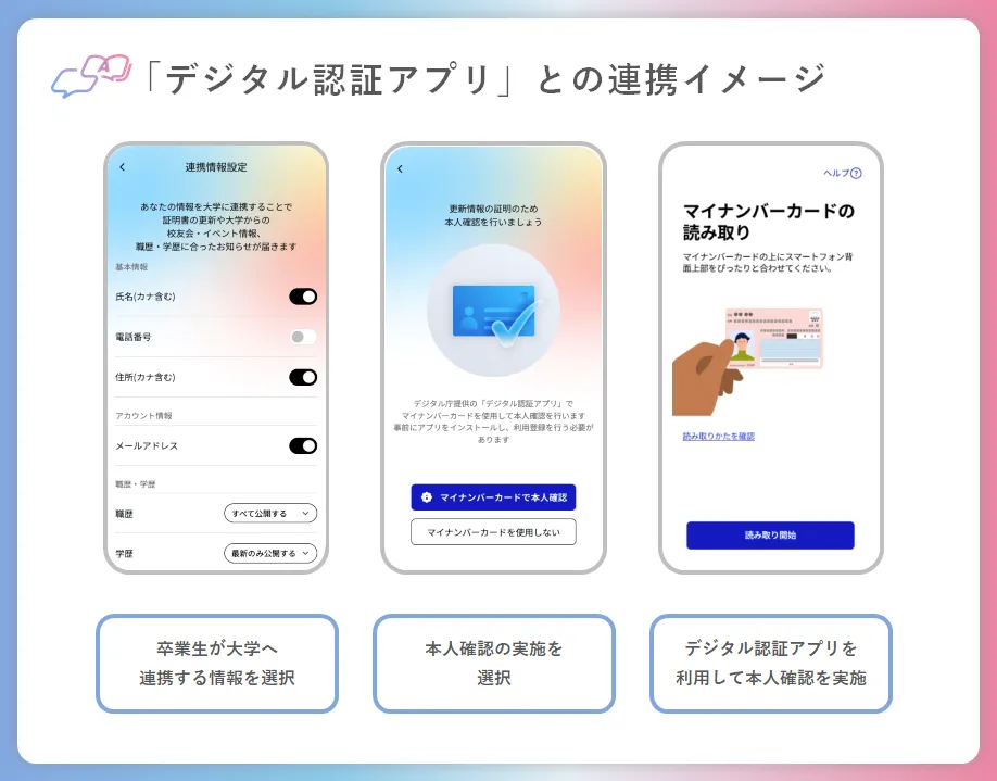 現在、マイナンバーカードの交付率が75%を超え、デジタル庁からも「デジタル認証アプリ」が提供されています。この背景から、卒業生の情報登録にあたって、本人確認を安全且つ簡単に行う手段としてアプリとの連携を実現しました。これにより、卒業生の本人確認作業が官民を問わず簡素化され、信頼性の高いデータ管理が可能になります。